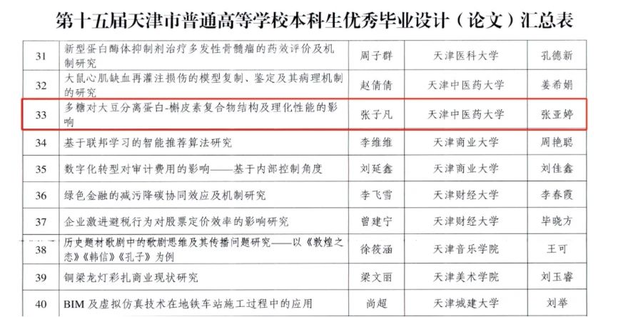近日,天津市教育委员会发布《关于公布第十五届天津市级本科生优秀毕业设计(论文)评审结果的通知》(津教高函〔2025〕15 号),公共卫生与健康科学学院2020级食品卫生与营养专业本科生张子凡的毕业论文《多糖引入对大豆分离蛋白—槲皮素二元复合物结合特性和功能性质的影响》(指导教师:张亚婷副教授)获评第十五届天津市级本科生优秀毕业论文。